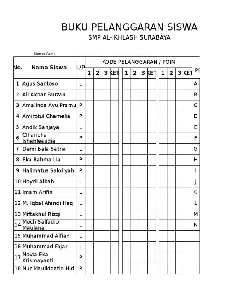 Buku piket yang berisi keterlambatan siswa dan ketidakhadiran siswa di sekolah/madrasah c. Contoh format buku piket guru sd seputaran guru. Pembinaan oleh piket/tercatat di buku piket, bila 2x datang terlambat diberi sanksi yang menimbulkan efek jera. Di dalam buku tersebut ditulis juga keterangan tindak lanjut yang dilakukan sebagai antisipasi atau solusinya. Catatan guru/wali kelas dan tenaga kependidikan yang memuat kedisiplinan waktu siswa 2 kedisiplinan berpakaian, dapat ditelaah dari: Bel masuk pukul 07.00 wib. Bp bk smp contoh buku pribadi siswa. Mencatat di buku siswa terlambat. 4 jurnal kelas yang mencantumkan data ketidakhadiran siswa di kelas dan data mata pelajaran yang diikuti siswa. Guru wali kelas sudah menuju ke kelas untuk pendampingan. Disiplin waktu disiplin kehadiran buku tata tertib buku point buku induk pelanggaran. Selian mencatat kehadiran guru dan siswa juga dapat berperan dalam penerima tamu dan juga menanggulangi jika terjadi. Buku piket yang berisi keterlambatan siswa dan ketidakhadiran siswa di sekolah.