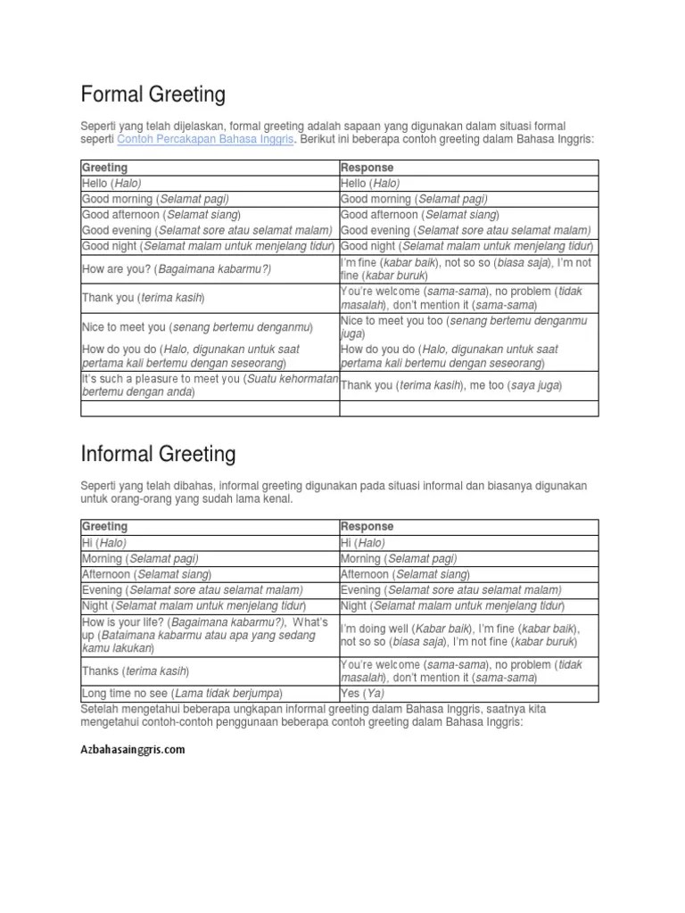 Jika anda berada dalam situasi formal seperti di kantor atau berbicara kepada orang yang tidak begitu kenal, sebaiknya gunakan bahasa inggris yang benar. Formal (resmi) atau informal (tidak resmi). Di dalam buku ini, anda bisa menemukan penjelasan yang rinci mengenai bahasa inggris formal dan informal, termasuk perbedaan keduanya, daftar kosakata, . Beberapa macam formal greeting dalam bahasa inggris: Ada banyak jenis surat dalam bahasa inggris. Beberapa informal letter dapat ditemukan di dalam . Salah satunya adalah contoh informal letter. We would like to begin the ceremony . Contoh i percakapan formal :. Ladies and gentleman due to unexpected accident, we shall apologize for the delay in starting the event. Pada dasarnya, kamu bisa menyapa orang dengan dua cara: Di bawah ini adalah contoh informal greeting beserta responsnya, jangan lupa dipraktikkan di rumah ya! Sementara contoh salam informal yakni:.